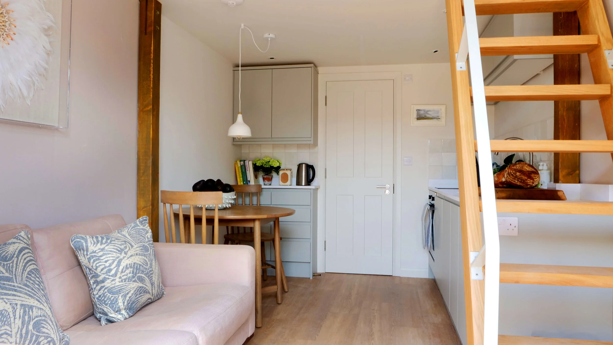 There is a Cox & Cox dining table, shower room with Artisans of Devizes tiles and a king size bedroom in the eaves on the open mezzanine floor above, accessed via a built-in wooden ladder.